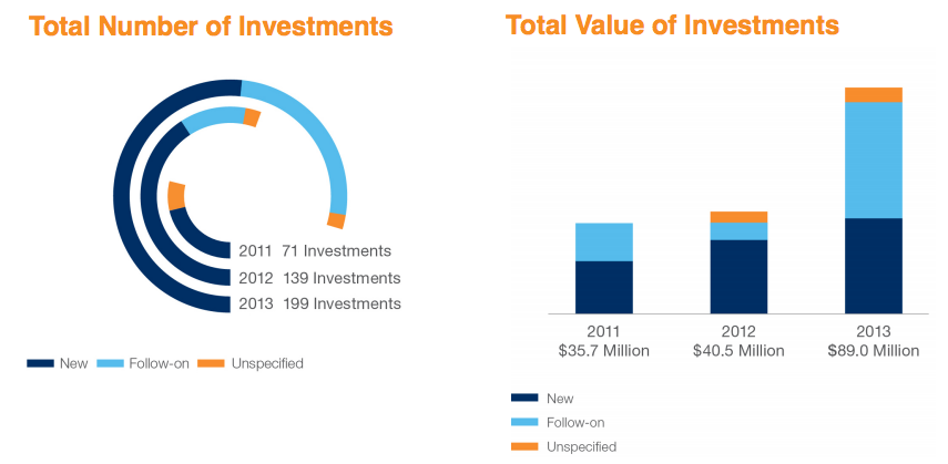 Another point of interest was the amount of companies that received investment after applying. 3,775 companies formally applied for funding in 2013 and just 301 went into the due diligence stage. Two-thirds of those companies actually received investment (199).