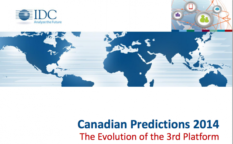 IDC Canada released its top ten technology predictions for 2014 yesterday via live webcast. The company’s predictions revolve around the shift to the “third platform”, or innovative industry solutions in social, big data, cloud and mobility. This has evolved from the “second platform”, or the legacy IT systems, like local area network (lan) Internet and servers.