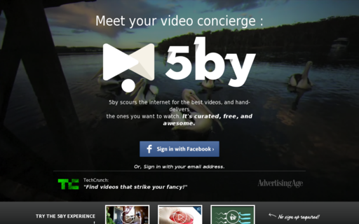 5by calls itself a personal video concierge, part of a growing trend of startups offering platforms offering passive viewing or listening experiences, like Songza for music. Users quickly input their moods and interests and 5by creates a personalized video playlist from its index of millions of online videos. With 5by, it’s actually possible to never search for videos again, as content recommendations are customized to peoples’ tastes as they watch and rate videos (although its unlikely, since people seem to enjoy searching some of the time).