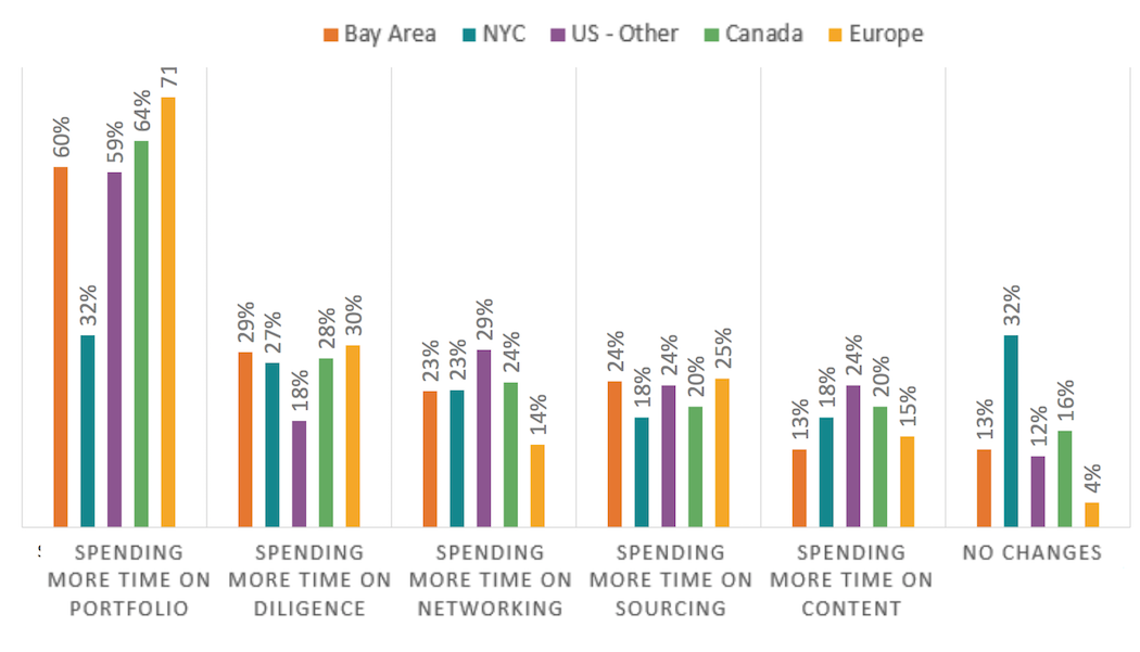 The pandemic is also changing the way VCs are spending their time. OMERS’ report found that 64 percent of Canadian firms reported spending more time on their portfolio during the pandemic. Venture capital firms in Canada and Europe are more than 20 percent more likely to report spending more time on their portfolio than US-based firms.