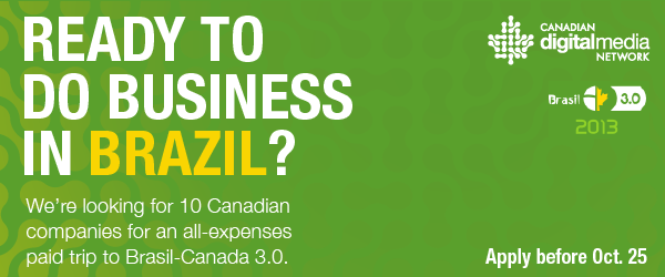 Ten Canadian startups, small or medium-sized businesses will be selected by the Canadian Digital Media Network (CDMN) to attend the Brasil-Canada 3.0 Conference in Joao Pessoa Brazil from December 4 – 6.