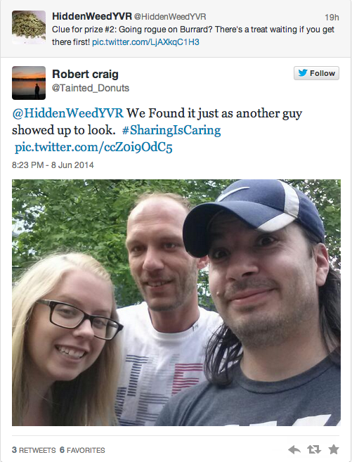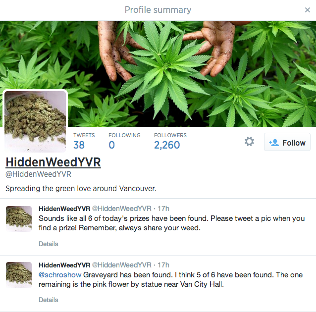 “@HiddenWeedYVR,” as Canada.com reported today, is following in the footsteps of “@HiddenCash“, which has over 466,000 followers. HiddenWeedYVR currently claims over 2,200 followers, who’ve been quick to show off their newfound presents as they find them.